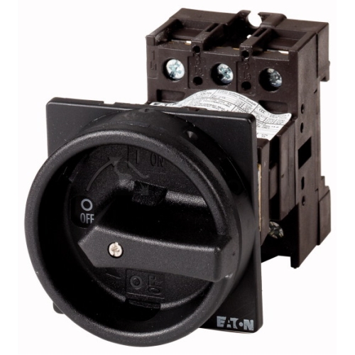 Hlavní spínač/vypínač podle IEC/EN 60947-3, 690V/25A, stupeň krytí vpředu IP65, rukojeť černá s blokovacím věncem černým, uzamykatelný v nulové poloze 3 visacími zámky, konstrukce zátěžových vypínačů P1 je velmi kompaktní a robustní. Ruční pohon působí na kontakty v přímém spojení. Při vypnutí se kontakty nuceně otevřou. Konstrukční formy všeobecně: Skříňky pro povrchovou montáž z izolačního materiálu, montáž, centrální upevnění, základní montáž, montáž do rozváděče IVS