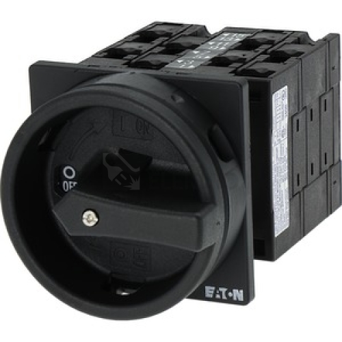 Vestavný hlavní vypínač podle normy IEC/EN60947, konstrukční velikost T3, tvar při montáži, stupeň krytí vpředu IP65 s černou ovládací pákou a žlutým blokovacím věncem uzamykatelné v nulové poloze, jmenovitý trvalý proud Iu 32 A, jmenovité provozní napětí Ue 690V, příslušenství k dodání podle údajů v katalogu Vačkové spínače T