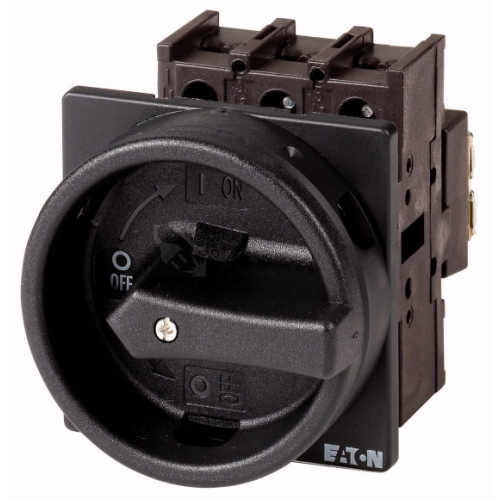 Hlavní spínač/vypínač podle IEC/EN 60947-3, 690V/32A, stupeň krytí vpředu IP65, rukojeť černá s blokovacím věncem černým, uzamykatelný v nulové poloze 3 visacími zámky, konstrukce zátěžových vypínačů P1 je velmi kompaktní a robustní. Ruční pohon působí na kontakty v přímém spojení. Při vypnutí se kontakty nuceně otevřou. Konstrukční formy všeobecně: Skříňky pro povrchovou montáž z izolačního materiálu, montáž, centrální upevnění, základní montáž, montáž do rozváděče IVS