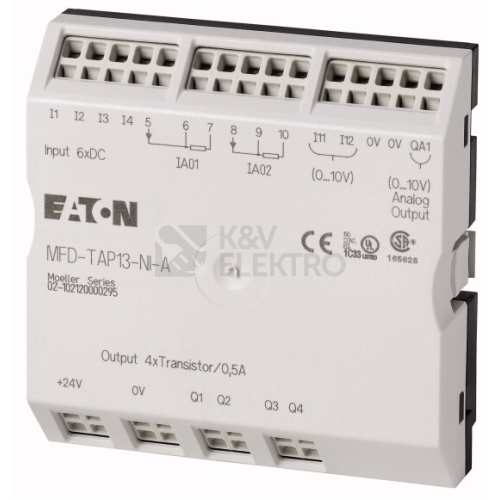 Modul I/O se snímáním teploty, napájecí zdroj 24VDC, zachycuje se na MFD-CP8 od verze přístroje 08/CP10, 6 digitálních vstupů, z toho 2 vstupy využitelné jako výstupy, 2 vstupů jako teplotní vstupy s Ni1000, 4 tranzistorové výstupy, 1 Analogový výstup, rozsah teplot lze nakonfigurovat: -40 až +90/0 až +250 °C