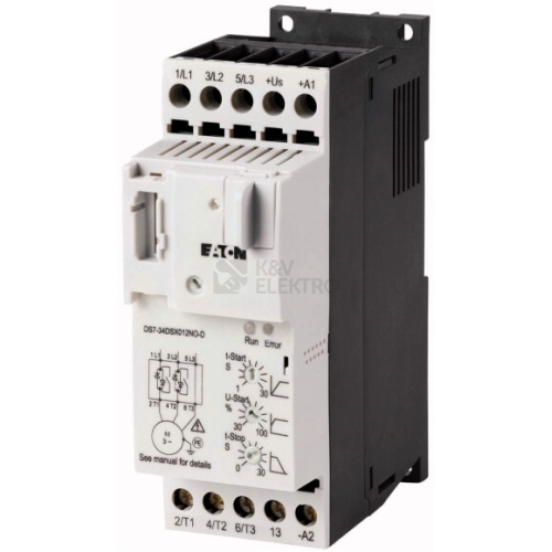 Typy řady DS7 jsou spouštěče s měkkým náběhem k měkkému spouštění třífázových motorů s normální četností spouštění pro rozsah výkonů od 4 do 200 A (1,5 kW až 110 kW při 400 V). Spínací přechodové jevy a podíly stejnosměrného proudu při spuštění jsou účinně potlačeny a zaručují stejnoměrný náběh motoru. Speciální způsob ovládání (asymetrické řízení zapalování / patent Eaton) pro funkci spouštěče nepoužívá stejnosměrné podíly proudu, které za normálních okolností vznikají ve dvoufázovém spouštěči s měkkým náběhem. Díky tomu se potlačí vznik eliptického točivého pole, které vede k nestejnoměrnému náběhu motoru a zbytečně tuto dobu prodlužuje.Rotační chování DS7 je díky tomu srovnatelné s třífázovým řízeným spouštěčem s měkkým náběhem. Ve všech verzích lze výrazně zredukovat lampy a topné zátěže (bez uzemněného bodu hvězdy) a navíc se při krátkodobé náběhové rampě při měkkém spouštění (min. 1 s) výrazně snižuje zapínací proud. Doby rampy a počátečního napětí lze nastavit pomocí potenciometru. Doby mohou dosahovat od 1 do 30 s (start) resp. 0 až 30 s (stop), počáteční napětí (počáteční krouticí moment) lze nastavit v rozsahu 30 až 100 % síťového napětí. Typy DS7-34-MX mají vnitřní překlenovací relé, které po skončení náběhu automaticky sepne a přemostí vnitřní tyristory. Díky této funkci se bez dalších opatření dosahuje stupně rádiového odrušení „B“. Tyto typy jsou dále vybaveny rozhraním Smartwire-DT, jehož prostřednictvím se DS7 řídí a lze nastavovat jeho parametry. Veškeré parametry jsou dostupné, nastavení potenciometrů přehledné. Ve spojení s PKE, který lze připojit přímo, jsou k dispozici další funkce. Tato kombinace disponuje ochranou přístrojů proti příliš častému zapínání resp. proti příliš velkému počtu zapnutí za hodinu nebo přetěžování v daném použití. K dispozici je také funkce omezení proudu a motorový proud lze omezit na nastavitelné hodnotě. Všechny prvky DS7-34D...D navíc nabízejí ve srovnání s konvenčně zapojeným přístrojem podstatně rozšířené diagnostické funkce. Kromě bezchybného propojení hovoří pro tento typ také podstatně snížené náklady na instalaci. Typické oblasti použití jako spouštěč s měkkým náběhem jsou pohony čerpadel – měkkým náběhem se předchází tlakovým rázům. Mechanické zatěžování celého zařízení klesá a tím roste životnost. Vzduchové pohony – díky měkkému náběhu nekloužou žádné klínové řemeny zamezuje předčasnému opotřebení. Díky tomu klesají provozní náklady a zvyšuje se životnost zařízení. Dopravníky – dopravník se spouští měkce namísto „škubnutí“. Dopravovaný materiál nepadá a samotný pás je mechanicky chráněn a díky tomu vydrží déle.