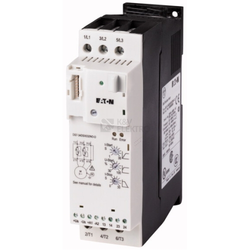 Typy řady DS7 jsou spouštěče s měkkým náběhem k měkkému spouštění třífázových motorů s normální četností spouštění pro rozsah výkonů od 4 do 200 A (1,5 kW až 110 kW při 400 V). Spínací přechodové jevy a podíly stejnosměrného proudu při spuštění jsou účinně potlačeny a zaručují stejnoměrný náběh motoru. Speciální způsob ovládání (asymetrické řízení zapalování / patent Eaton) pro funkci spouštěče nepoužívá stejnosměrné podíly proudu, které za normálních okolností vznikají ve dvoufázovém spouštěči s měkkým náběhem. Díky tomu se potlačí vznik eliptického točivého pole, které vede k nestejnoměrnému náběhu motoru a zbytečně tuto dobu prodlužuje.Rotační chování DS7 je díky tomu srovnatelné s třífázovým řízeným spouštěčem s měkkým náběhem. Ve všech verzích lze výrazně zredukovat lampy a topné zátěže (bez uzemněného bodu hvězdy) a navíc se při krátkodobé náběhové rampě při měkkém spouštění (min. 1 s) výrazně snižuje zapínací proud. Doby rampy a počátečního napětí lze nastavit pomocí potenciometru. Doby mohou dosahovat od 1 do 30 s (start) resp. 0 až 30 s (stop), počáteční napětí (počáteční krouticí moment) lze nastavit v rozsahu 30 až 100 % síťového napětí. Typy DS7-34-MX mají vnitřní překlenovací relé, které po skončení náběhu automaticky sepne a přemostí vnitřní tyristory. Díky této funkci se bez dalších opatření dosahuje stupně rádiového odrušení „B“. Tyto typy jsou dále vybaveny rozhraním Smartwire-DT, jehož prostřednictvím se DS7 řídí a lze nastavovat jeho parametry. Veškeré parametry jsou dostupné, nastavení potenciometrů přehledné. Ve spojení s PKE, který lze připojit přímo, jsou k dispozici další funkce. Tato kombinace disponuje ochranou přístrojů proti příliš častému zapínání resp. proti příliš velkému počtu zapnutí za hodinu nebo přetěžování v daném použití. K dispozici je také funkce omezení proudu a motorový proud lze omezit na nastavitelné hodnotě. Všechny prvky DS7-34D...D navíc nabízejí ve srovnání s konvenčně zapojeným přístrojem podstatně rozšířené diagnostické funkce. Kromě bezchybného propojení hovoří pro tento typ také podstatně snížené náklady na instalaci. Typické oblasti použití jako spouštěč s měkkým náběhem jsou pohony čerpadel – měkkým náběhem se předchází tlakovým rázům. Mechanické zatěžování celého zařízení klesá a tím roste životnost. Vzduchové pohony – díky měkkému náběhu nekloužou žádné klínové řemeny zamezuje předčasnému opotřebení. Díky tomu klesají provozní náklady a zvyšuje se životnost zařízení. Dopravníky – dopravník se spouští měkce namísto „škubnutí“. Dopravovaný materiál nepadá a samotný pás je mechanicky chráněn a díky tomu vydrží déle.
