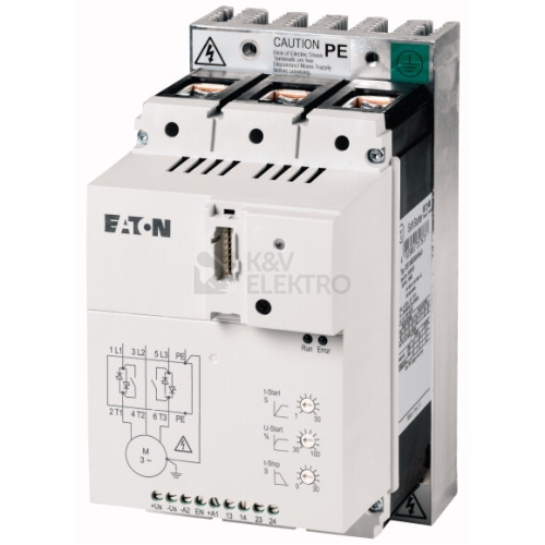 Typy řady DS7 jsou spouštěče s měkkým náběhem k měkkému spouštění třífázových motorů s normální četností spouštění pro rozsah výkonů od 4 do 200 A (1,5 kW až 110 kW při 400 V). Spínací přechodové jevy a podíly stejnosměrného proudu při spuštění jsou účinně potlačeny a zaručují stejnoměrný náběh motoru. Speciální způsob ovládání (asymetrické řízení zapalování / patent Eaton) pro funkci spouštěče nepoužívá stejnosměrné podíly proudu, které za normálních okolností vznikají ve dvoufázovém spouštěči s měkkým náběhem. Díky tomu se potlačí vznik eliptického točivého pole, které vede k nestejnoměrnému náběhu motoru a zbytečně tuto dobu prodlužuje.Rotační chování DS7 je díky tomu srovnatelné s třífázovým řízeným spouštěčem s měkkým náběhem. Ve všech verzích lze výrazně zredukovat lampy a topné zátěže (bez uzemněného bodu hvězdy) a navíc se při krátkodobé náběhové rampě při měkkém spouštění (min. 1 s) výrazně snižuje zapínací proud. Doby rampy a počátečního napětí lze nastavit pomocí potenciometru. Doby mohou dosahovat od 1 do 30 s (start) resp. 0 až 30 s (stop), počáteční napětí (počáteční krouticí moment) lze nastavit v rozsahu 30 až 100 % síťového napětí. Typy DS7-34-MX mají vnitřní překlenovací relé, které po skončení náběhu automaticky sepne a přemostí vnitřní tyristory. Díky této funkci se bez dalších opatření dosahuje stupně rádiového odrušení „B“. Tyto typy jsou dále vybaveny rozhraním Smartwire-DT, jehož prostřednictvím se DS7 řídí a lze nastavovat jeho parametry. Veškeré parametry jsou dostupné, nastavení potenciometrů přehledné. Ve spojení s PKE, který lze připojit přímo, jsou k dispozici další funkce. Tato kombinace disponuje ochranou přístrojů proti příliš častému zapínání resp. proti příliš velkému počtu zapnutí za hodinu nebo přetěžování v daném použití. K dispozici je také funkce omezení proudu a motorový proud lze omezit na nastavitelné hodnotě. Všechny prvky DS7-34D...D navíc nabízejí ve srovnání s konvenčně zapojeným přístrojem podstatně rozšířené diagnostické funkce. Kromě bezchybného propojení hovoří pro tento typ také podstatně snížené náklady na instalaci. Typické oblasti použití jako spouštěč s měkkým náběhem jsou pohony čerpadel – měkkým náběhem se předchází tlakovým rázům. Mechanické zatěžování celého zařízení klesá a tím roste životnost. Vzduchové pohony – díky měkkému náběhu nekloužou žádné klínové řemeny zamezuje předčasnému opotřebení. Díky tomu klesají provozní náklady a zvyšuje se životnost zařízení. Dopravníky – dopravník se spouští měkce namísto „škubnutí“. Dopravovaný materiál nepadá a samotný pás je mechanicky chráněn a díky tomu vydrží déle.