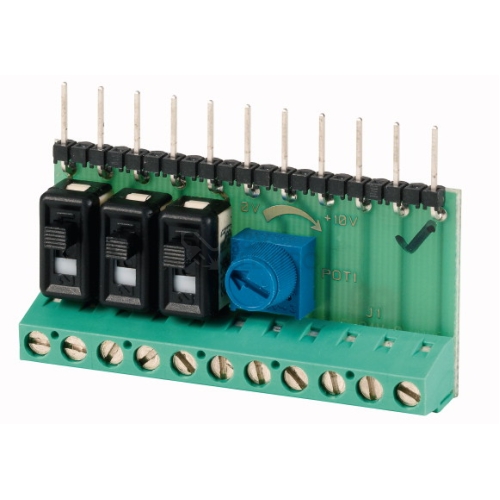 Simulátor řídicích svorek, Označení typu: DC1, Dílčí sortiment: Simulátor řídicích svorek, Základní funkce: Simulátor pro testování a uvedení do provozu, Popis: 3 digitální vstupy (+24 V), 1 reléový výstup (max. 30 V DC), 3 mikrospínače, 1 potenciometr jmenovité hodnoty (0 - +10 V / = 0 - fmax), pro připojení na řídicí svorky DC1, Použitelný pro: DC1