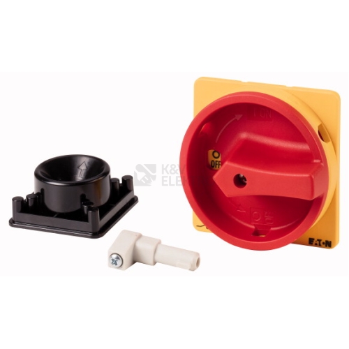 Rukojeť, Základní funkce: Stavebnice, funkce: Montážní kity hlavního vypínače, výhradně pro hlavní spínač, s Možnost uzamčení visacím zámkem, k blokování nulové polohy, uzamykatelný pomocí maximálně 3 visacích třmenových zámků, Použitelný pro: P3…/M…, červeno/žlutý, typ S červenou otočnou ovládací pákou a žlutou objímkou, NOUZOVÉ VYPNUTÍ / NOUZOVÉ ZASTAVENÍ: jako funkce NOUZOVÉ VYPNUTÍ / NOUZOVÉ ZASTAVENÍ, Spínací úhel: 90 °