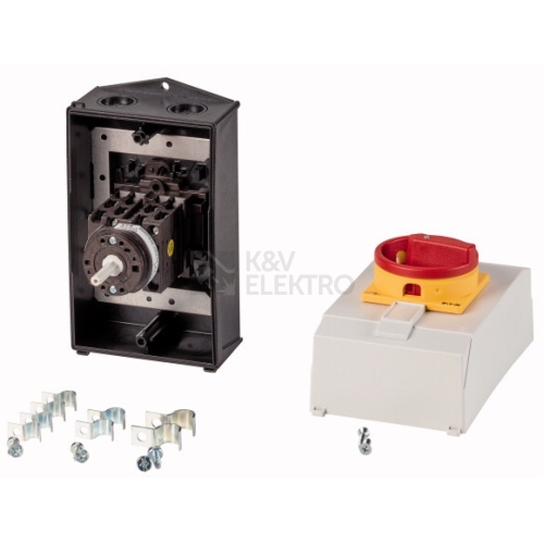 Hlavní spínač, Sortiment: Hlavní vypínač, Přepínač údržby, Vypínače pro opravy, Označení typu: T0, Funkce STOP: Funkce nouzového vypnutí, S červenou otočnou ovládací pákou a žlutou objímkou, poznámka: Provedení s vylamovacími otvory, s Stínění montážního plechu, 6pólové, Možnost uzamčení: Uzamykatelný v poloze 0, Stupeň krytí: IP 65, Provedení: Povrchová montáž, Spínací úhel: 90 °, Výkon motoru AC-23A, 50 - 60 Hz 400 V: P = 5.5 kW, Jmenovitý trvalý proud: Iu = 20 A, 4 Modul(y), Normy a ustanovení: ČSN EN 60947, VDE 0660, ČSN EN 60204, Vypínače podle normy ČSN EN 60947-3