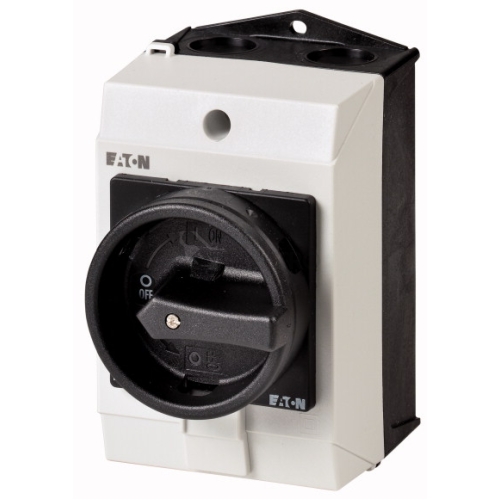 Hlavní spínač podle IEC/EN60947, konstrukční velikost T0, ve skříňce pro povrchovou montáž, stupeň krytí IP65 s černou ovládací pákou a žlutým blokovacím věncem uzamykatelné v nulové poloze, jmenovitý trvalý proud Iu 20 A, jmenovité provozní napětí Ue 690V, příslušenství k dodání podle údajů v katalogu Vačkové spínače T. Konstrukční formy všeobecně: skříňky pro povrchovou montáž z izolačního materiálu, montáž, centrální upevnění, základní montáž, montáž do rozváděče IVS