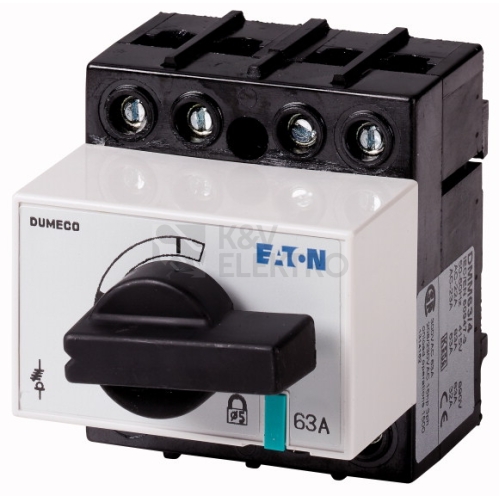 Vypínač Dumeco typ DMM63/4, spínací výkon ≦ 63 A, 4pólové, s pevnou ovládací pákou, s osou a ovládací pákou výška spínače: 107 mm (od dolní strany spínače k horní straně ovládací osy / páky)., k montáži na podlahu, vertikální připojení