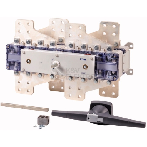 Vypínače, Sortiment: Odpínač, Hlavní vypínač, Přepínač údržby, Označení typu: DMV, s šedou otočnou pákou a prodlužovací osou, Poznámky: viditelné kontakty, Informace k rozsahu dodávky: včetně připojovacího příslušenství, 4pólové, Stupeň krytí: IP00, IP20 s krytem svorek, Provedení: Povrchová montáž, Výkon motoru AC-23A, 50 - 60 Hz 400 V: P = 1400 kW, Jmenovitý trvalý proud: Iu = 2500 A, Normy a ustanovení: ČSN EN 60947, VDE 0660, ČSN EN 60204, Vypínače podle normy ČSN EN 60947-3