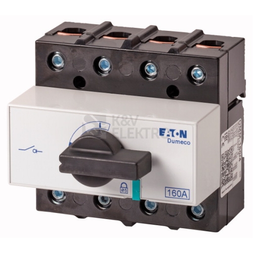 Vypínače, Sortiment: Odpínač, Hlavní vypínač, Přepínač údržby, Označení typu: DMM, s černou otočnou pákou a prodlužovací osou, Poznámky: viditelné kontakty, Informace k rozsahu dodávky: Pomocný kontakt lze namontovat dodatečně., včetně připojovacího příslušenství, 4pólové, Stupeň krytí: IP20, Provedení: Povrchová montáž, Výkon motoru AC-23A, 50 - 60 Hz 400 V: P = 80 kW, Jmenovitý trvalý proud: Iu = 160 A, Normy a ustanovení: ČSN EN 60947, VDE 0660, ČSN EN 60204, Vypínače podle normy ČSN EN 60947-3