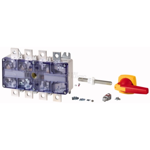 Vypínače, Sortiment: Odpínač, Hlavní vypínač, Přepínač údržby, Označení typu: DMV, Funkce STOP: Funkce nouzového vypnutí, S červenou otočnou ovládací pákou a žlutou objímkou, poznámka: S kovovou osou pro hloubku rozváděčové skříně 400 mm, Informace k rozsahu dodávky: Pomocný kontakt lze namontovat dodatečně., 3-pólové, Stupeň krytí: Vpředu IP65, Provedení: Zadní montáž, Výkon motoru AC-23A, 50 - 60 Hz 400 V: P = 147 kW, Jmenovitý trvalý proud: Iu = 250 A, Normy a ustanovení: ČSN EN 60947, VDE 0660, ČSN EN 60204, Vypínače podle normy ČSN EN 60947-3