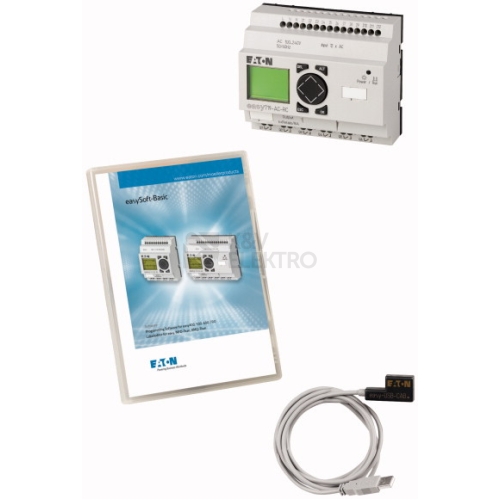 Základní souprava ke snadnému vstupu do řídicí techniky. Základní souprava ke snadnému vstupu do řídicí techniky. Základní souprava obsahuje řídicí relé EASY719-AC-RC, programové vedení easy-USB-CAB k připojení řídicího relé k USB rozhraní PC, programovací software easySoft-Basic na CD a dokumentaci a příručku jako PDF. K dispozici jsou digitální vstupy (8), výstupy (6) (relé 8A).