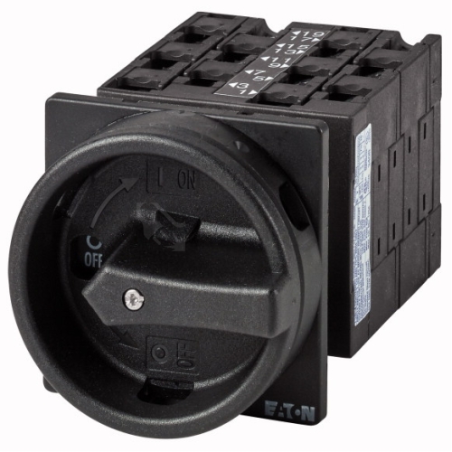 Vestavný hlavní vypínač podle normy IEC/EN60947, konstrukční velikost T3, tvar při montáži, stupeň krytí vpředu IP65 s černou ovládací pákou a žlutým blokovacím věncem uzamykatelné v nulové poloze, jmenovitý trvalý proud Iu 32 A, jmenovité provozní napětí Ue 690V, příslušenství k dodání podle údajů v katalogu Vačkové spínače T