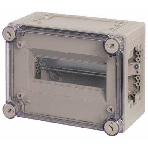 Instalační skříňka, patentované upevňovací šrouby víka s integrovaným vyrovnáním přetlaku, material: Polykarbonát, odolná proti nárazům, stupeň krytí IP65, bočnice uzavřené, vylamovací, stěny nahoře a dole otevřené, vestavné přístroje konstrukční velikosti 1 podle normy DIN 43880, kryt průhledný se zamykacími rukojeťmi, DIN lišty k uchycení přístrojů, zaslepovací pás do nepoužívaných vestavných míst, krycí panel s popisovacím páskem, upevňovací šrouby s možností plombování, provedení krytu: průhledné, provedení dolní části: uzavřené, vylamovací, hloubka=150 mm, počet HP=9