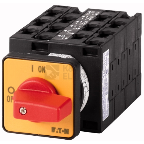 Vačkové spínače podle ČSN/EN60947, konstrukční velikost T3, tvar při montáži, žlutý přední štítek 48x48, stupeň krytí vpředu IP65 s červenou pákou, jmenovitý trvalý proud Iu 32 A, jmenovité provozní napětí Ue 690V, příslušenství k dodání podle údajů v katalogu Vačkové spínače T