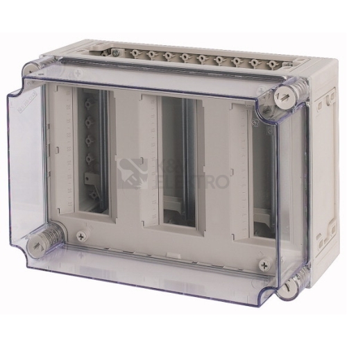 Instalační skříňka, patentované upevňovací šrouby víka s integrovaným vyrovnáním přetlaku, material: Polykarbonát, odolná proti nárazům, stupeň krytí IP65, bočnice uzavřené, vylamovací, stěny nahoře a dole otevřené, vestavné přístroje konstrukční velikosti 1 podle normy DIN 43880, kryt průhledný se zamykacími rukojeťmi, DIN lišty k uchycení přístrojů, zaslepovací pás do nepoužívaných vestavných míst, krycí panel s popisovacím páskem, upevňovací šrouby s možností plombování, provedení krytu: průhledné, provedení dolní části: uzavřené, vylamovací, hloubka=225 mm, počet HP=27