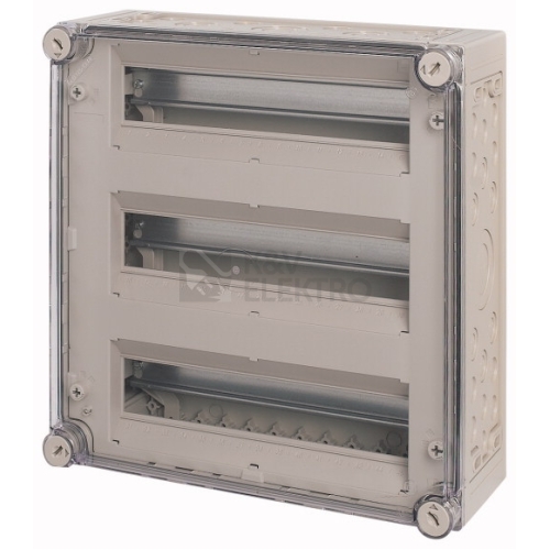 Instalační skříňka, patentované upevňovací šrouby víka s integrovaným vyrovnáním přetlaku, material: Polykarbonát, odolná proti nárazům, stupeň krytí IP65, bočnice uzavřené, vylamovací, stěny nahoře a dole otevřené, vestavné přístroje konstrukční velikosti 1 podle normy DIN 43880, kryt průhledný se zamykacími rukojeťmi, DIN lišty k uchycení přístrojů, zaslepovací pás do nepoužívaných vestavných míst, krycí panel s popisovacím páskem, upevňovací šrouby s možností plombování, provedení krytu: průhledné, provedení dolní části: uzavřené, vylamovací, hloubka=150 mm, počet HP=45