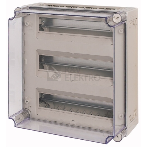 Instalační skříňka, patentované upevňovací šrouby víka s integrovaným vyrovnáním přetlaku, material: Polykarbonát, odolná proti nárazům, stupeň krytí IP65, bočnice uzavřené, vylamovací, stěny nahoře a dole otevřené, vestavné přístroje konstrukční velikosti 1 podle normy DIN 43880, kryt průhledný se zamykacími rukojeťmi, DIN lišty k uchycení přístrojů, zaslepovací pás do nepoužívaných vestavných míst, krycí panel s popisovacím páskem, upevňovací šrouby s možností plombování, provedení krytu: průhledné, provedení dolní části: uzavřené, vylamovací, hloubka=225 mm, počet HP=45