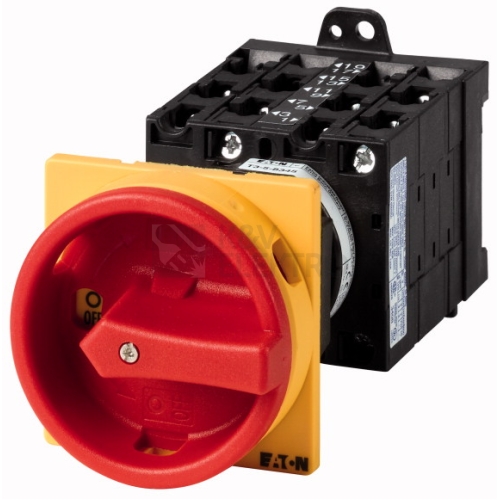 Hlavní spínač podle IEC/EN60947, konstrukční velikost T3, forma zadní montáže na DIN lištu, stupeň krytí vpředu IP65 s červenou ovládací pákou a žlutým blokovacím věncem uzamykatelné v nulové poloze, jmenovitý trvalý proud Iu 32 A, jmenovité provozní napětí Ue 690V, příslušenství k dodání podle údajů v katalogu Vačkové spínače T