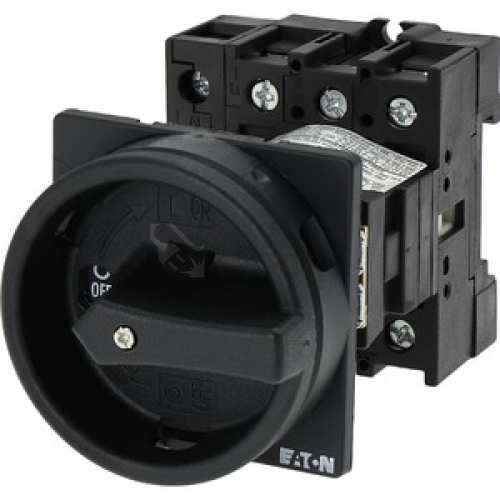 Hlavní spínač/vypínač podle IEC/EN 60947-3, 690V/25A, stupeň krytí vpředu IP65, rukojeť černá s blokovacím věncem černým, uzamykatelný v nulové poloze 3 visacími zámky, konstrukce zátěžových vypínačů P1 je velmi kompaktní a robustní. Ruční pohon působí na kontakty v přímém spojení. Při vypnutí se kontakty nuceně otevřou. Konstrukční formy všeobecně: Skříňky pro povrchovou montáž z izolačního materiálu, montáž, centrální upevnění, základní montáž, montáž do rozváděče IVS
