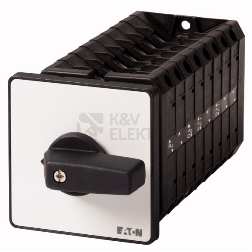 Vačkové spínače podle IEC/EN60947-3, konstrukční velikost T5B, 690 V/63A, stupeň krytí vpředu IP65, T-rukojeť, konstrukční formy všeobecně: Skříňky pro povrchovou montáž z izolačního materiálu, montáž základní montáž. Výkonové, robustní a kompaktní vačkové spínače T se používají v průmyslu, řemeslech i technickém vybavení budov. Na výběr je celá řada standardních obvodů. Jako doplněk se realizují zvláštní obvody specifické pro jednotlivé zákazníky. Zde jsou možnosti téměř neomezené. Program spínačů doplňuje rozsáhlé příslušenství a doplňuje možnosti využití. Všechny proudové dráhy jsou vybaveny dvojitě přerušovanými kontakty.