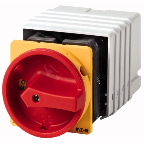 Hlavní spínač podle IEC/EN60947-3, konstrukční velikost T5B, 690 V/63A, stupeň krytí vpředu IP65, uzamykatelný v nulové poloze s 3 visacími zámky, konstrukční formy všeobecně: Skříňky pro povrchovou montáž z izolačního materiálu, montáž základní montáž. Výkonové, robustní a kompaktní vačkové spínače T se používají v průmyslu, řemeslech i technickém vybavení budov. Na výběr je celá řada standardních obvodů. Jako doplněk se realizují zvláštní obvody specifické pro jednotlivé zákazníky. Zde jsou možnosti téměř neomezené. Program spínačů doplňuje rozsáhlé příslušenství a doplňuje možnosti využití. Všechny proudové dráhy jsou vybaveny dvojitě přerušovanými kontakty.