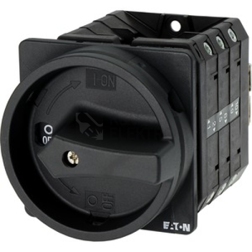 Hlavní spínač podle IEC/EN60947-3, konstrukční velikost T5B, 690 V/63A, stupeň krytí vpředu IP65, uzamykatelný v nulové poloze s 3 visacími zámky, konstrukční formy všeobecně: Skříňky pro povrchovou montáž z izolačního materiálu, montáž základní montáž. Výkonové, robustní a kompaktní vačkové spínače T se používají v průmyslu, řemeslech i technickém vybavení budov. Na výběr je celá řada standardních obvodů. Jako doplněk se realizují zvláštní obvody specifické pro jednotlivé zákazníky. Zde jsou možnosti téměř neomezené. Program spínačů doplňuje rozsáhlé příslušenství a doplňuje možnosti využití. Všechny proudové dráhy jsou vybaveny dvojitě přerušovanými kontakty.