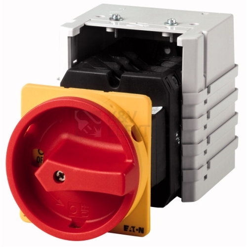 Hlavní spínač podle IEC/EN60947-3, konstrukční velikost T5, 690 V/100A, stupeň krytí vpředu IP65, uzamykatelný v nulové poloze s 3 visacími zámky, konstrukční formy všeobecně: Skříňky pro povrchovou montáž z izolačního materiálu, montáž základní montáž. Výkonové, robustní a kompaktní vačkové spínače T se používají v průmyslu, řemeslech i technickém vybavení budov. Na výběr je celá řada standardních obvodů. Jako doplněk se realizují zvláštní obvody specifické pro jednotlivé zákazníky. Zde jsou možnosti téměř neomezené. Program spínačů doplňuje rozsáhlé příslušenství a doplňuje možnosti využití. Všechny proudové dráhy jsou vybaveny dvojitě přerušovanými kontakty.