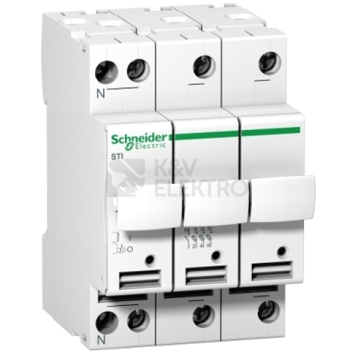Tento Acti 9 STI odpojovač pojistky je nízkonapěťový. Používá se pro terciární a průmyslové aplikace, které vyžadují vysokou vypínací kapacitu. Má pól 3P+N, až 10A jmenovitý proud a pojistku gG nebo aM s typem pojistky 8,5mm x 31,5mm. lze jej upevnit na lištu DIN pro modulární instalaci. Pojistka pro všeobecné použití (pojistka gG) poskytuje ochranu proti přetížení a zkratu. Pojistka aM pro aplikace motorů poskytuje ochranu proti zkratu (ochrana zařízení s vysokým špičkovým proudem). má stupeň ochrany IP20 na svorkách, takže je jednou IP40 v modulární skříni. Nacvakávací značka je viditelná na přední straně nebo na přiřazené svorce a identifikuje přítomnost pojistky. Volitelné neonové světlo 230V signalizuje zhasnutí pojistky (vypnutí při běžném provozu a svítí červeně po vyfukování pojistky). Zařízení je vybaveno držákem pojistky a přídavným krytem pro náhradní pojistku. Páčka může být také zamknutá.