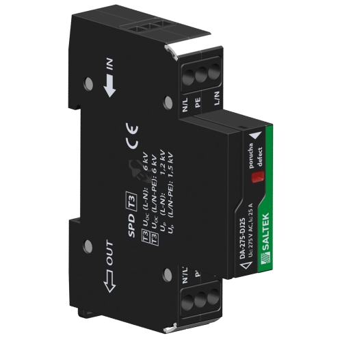 Optická signalizace poruchy, průchozí přepěťová ochrana pro univerzální použití k ochraně všech druhů elektrických a elektronických zařízení nn proti pulsnímu přepětí, instalace do rozvodů nn v blízkosti chráněného zařízení, k ochraně zařízení proti účinkům indukovaného přepětí při úderu blesku a proti spínacímu přepětí