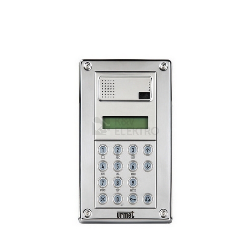 Centrální jednotka s číselnou klávesnicí, displejem s pamětí a hlasovou jednotkou do modulárního tlačítkového panelu SINTHESI STEEL (1158), 2 moduly.Základní vlastnosti- Volitelná jazyková verze textu displeje.- Zvonění zadáním fyzického kódu (2 číslice pro stoupačku a 3 číslice pro byt) pro max. 32 stoupaček a 128 účastníků).- Alfanumerická klávesnice.- Paměť pro 4200 jmen s možností přiřadit 4 místný logický volací kód ke každému jménu.- Ke každému jménu možnost přiřadit 4 místný kód pro ovládání el. zámku.- Možnost zadat 100 nezávislých 4 místných kódů pro ovládání el. zámku.- Vyhledání jména zadáním počátečního písmene a pomocí tlačítek se šipkami.- Možnost nastavit funkci „Pošta“, kdy v zadaný den a hodinu je povolen vstup tlačítkem s klíčkem.- Přímé volání na ústřednu stisknutím dvou tlačítek současně.- Video vstup pro kameru nebo videopřepínač 1038/69.- Vstup pro kontakt signalizace otevřených dveří.- Vstup pro ovládání zámku tlačítkem zevnitř budovy.- Nastavitelná citlivost mikrofonu a hlasitost reproduktoru.- Výstup pro ovládání vjezdové brány (2. zámek).- Možnost programování jednotky programem URMET přes Bluetooth spojení.Řada SINTHESI STEEL je modulárním řešením vstupního panelu typu antivandal. Jedná se o robustní, avšak elegantní a moderní panel z leštěné nerezové oceli. Jeho mechanická odolnost je definována indexem IK09 a krytí hodnotou IP45.
