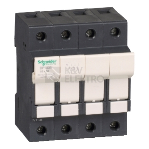 TeSys DF modulární držák pojistek, 4P (3P+N), pro ochranu ovládacích obvodů až do 32 A/690 V. Používá se s pojistkami 10 x 38 mm až 32 A a zkratovým proudem až na 120kA@400V. Je vybaven nulovým pólem vybaveným pojistným trubkovým spojem. Kompaktní (šířka 70mm), lze ji použít v modulárních panelech, nacvakáním na 35mm lištu DIN, připojením šroubovými svorkami, visací zámek bez příslušenství. K dispozici jsou pojistkové spoje (10x38mm aM, typ gG) a pomocná zařízení (sady pro montáž pojistky, nacvakávací značky) (objednat samostatně). Prodává se v šarži 3 jednotek. Certifikováno více standardů (IEC, UL uznáno, CSA, CCC, EAC, Marine), produkt Green Premium (RoHS/REACh).