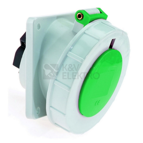 CEE zásuvka vestavná šikmá16A 4p (3P+PE) >50V zelený >300-500Hz (> 50V) 2 h IP67 frekvence: od 300 do 500Hz kód barvy: zelený RAL 6002 kontakty: nosič kontaktů je vyroben z polyamidu, kontakty jsou vyrobeny z mosazi maximální průřez vodiče: 4,0 mm2materiál krytu: polyamid způsob připojení: se šroubovými svorkamibarva: víčko sklopné zelené, kryt šedý rozměry: výška 100 mm, šířka 92 mm, hloubka 83 mm rozměr příruby: svisle 100 mm, vodorovně 92 mm rozteč montážních otvorů: vodorovně 85 mm, svisle 77 mm další technické vlastnosti:sklon 20°