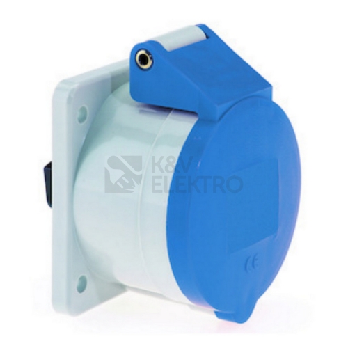 CEE zásuvka vestavná přímá16A 3p (2P+PE) 230V (200 do 250V~) 6h IP44 frekvence: 50 a 60Hz kód barvy: modrá RAL 5015 kontakty: nosič kontaktů je vyroben z polyamidu, kontakty jsou vyrobeny z mosazi maximální průřez vodiče: 4,0 mm2materiál krytu: polyamid způsob připojení: se šroubovými svorkamibarva: víčko sklopné modré, kryt šedý rozměry: výška 71 mm, šířka 56 mm, hloubka 67 mm rozměr příruby: svisle 56 mm, vodorovně 56 mm