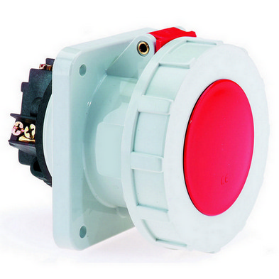 CEE zásuvka vestavná přímá63A 4p (3P+PE) 400V (380 do 415V~) 6h IP67 frekvence: 50 a 60Hz kód barvy: červená RAL 3000 kontakty: nosič kontaktů je vyroben z materiálu odolného vůči vysokým teplotám, kontakty jsou vyrobeny z mosazi, povrch kontaktů je poniklovaný maximální průřez vodiče: 25,0 mm2materiál krytu: polyamid způsob připojení: šroubová rámová svorkabarva: víčko sklopné červené, bajonetový uzávěr šedý, kryt šedý rozměry: výška 114 mm, šířka 111 mm, hloubka 133 mm rozměr příruby: svisle 107 mm, vodorovně 100 mm rozteč montážních otvorů: vodorovně 85 mm, svisle 77 mm