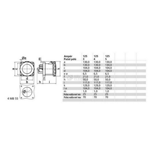 CEE zásuvka vestavná přímá125A 5p (3P+N+PE) 400V (200/346 do 240/415V~) 6h IP67 frekvence: 50 a 60Hz kód barvy: červená RAL 3000 kontakty: nosič kontaktů je vyroben z materiálu odolného vůči vysokým teplotám, kontakty jsou vyrobeny z mosazi, povrch kontaktů je poniklovaný maximální průřez vodiče: 70,0 mm2materiál krytu: polyamid způsob připojení: šroubová rámová svorkabarva: víčko sklopné červené, bajonetový uzávěr šedý, kryt šedý rozměry: výška 130 mm, šířka 130 mm, hloubka 167 mm rozměr příruby: svisle 130 mm, vodorovně 130 mm rozteč montážních otvorů: vodorovně 104 mm, svisle 104 mm