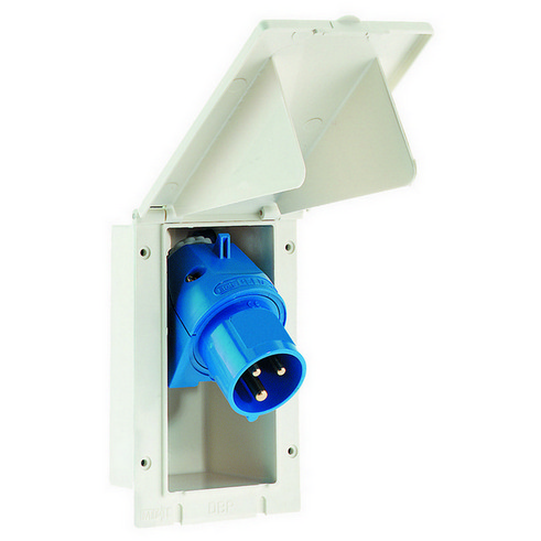 CEE přívodka vestavná s výklopným krytem16A 3p (2P+PE) 230V (200 do 250V~) 6h IP44 frekvence: 50 a 60Hz kód barvy: bílá RAL 5015 rozměr krytu: výška 163 mm, šířka 102 mmkontakty: nosič kontaktů je vyroben z polyamidu, kontakty jsou vyrobeny z mosazi maximální průřez vodiče: 2,5 mm2materiál krytu: ABS systém připojení: se šroubovými svorkami přívod kabelu: do průměru 13,5 barva: spodní část pouzdra modrá, límec modrý, pouzdro modré rozměry: výška 170 mm, šířka 102 mm, hloubka 75 mm další technické vlastnosti:upevňovací otvory 103x 88, montážní otvor 135x 70, průchodka pro kabel