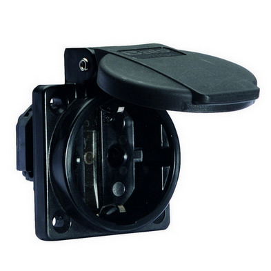 Vestavná zásuvka, německý standard SCHUKO16A 3p (2P+PE) 250V (250V) IP54 frekvence: střídavý proud (AC) kód barvy: černá RAL 9005 kontakty: nosič kontaktů je vyroben z polyamidu, kontakty jsou vyrobeny z mosazi, povrch kontaktů je poniklovaný maximální průřez vodiče: 4,0 mm2materiál krytu: polyamid způsob připojení: šroubová svorka typ: VDE systémbarva: kryt černý, víčko sklopné černé rozměry: výška 61.5 mm, šířka 50 mm, hloubka 47.5 mm rozměr příruby: svisle 50 mm, vodorovně 50 mm rozteč montážních otvorů: vodorovně 38 mm, svisle 38 mm Halogen free: ANO další technické vlastnosti:připojení zezadu, pro použití ve stacionárních rozvodech