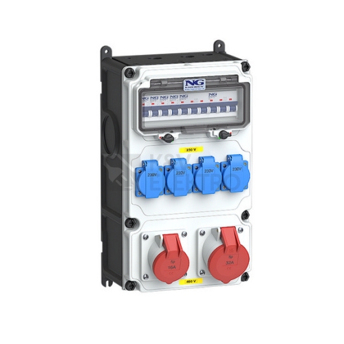 Zásuvka 1x CEE 32A 5p 400V, 1x CEE 16A 5p 400V, 4x 16A 230V, jističe
