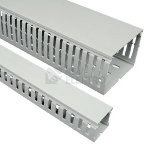 Rozváděčový kanál RK 100X50 HF LD, tmavě šedý, 2 m, karton, bezhalogenový. Optimální zavírání, lehká montáž a demontáž, pevně fixova ný kryt, snadné vylomení žebra u dna kanálu. Dodáván včetně víka.