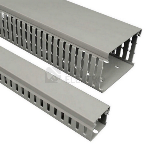 Rozváděčový kanál RK 75X75 DIN LD, tmavě šedý, 2 m, karton, DIN. Optimální zavírání, lehká montáž a demontáž, pevně fixovaný kryt, snadné vylomení žebra u dna kanálu. Dodáván včetně víka.