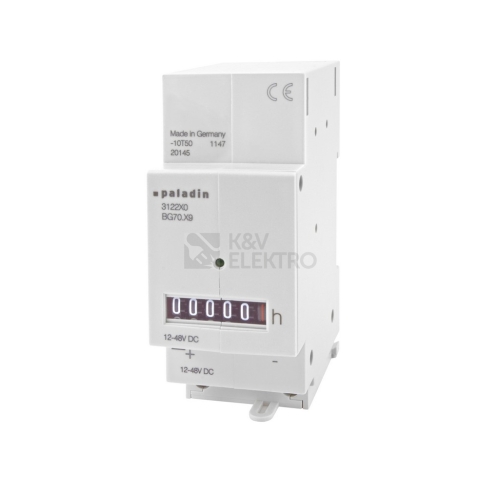 Počítadlo provozních hodin PALADIN 312270 (BG 70.29) - napětí 12-48V DC, bez krytu svorek, velikost číslic 4,4mm, kapacita hodin 99999, 2 modulové, montáž na DIN lištu, krytí IP50, barva šedá