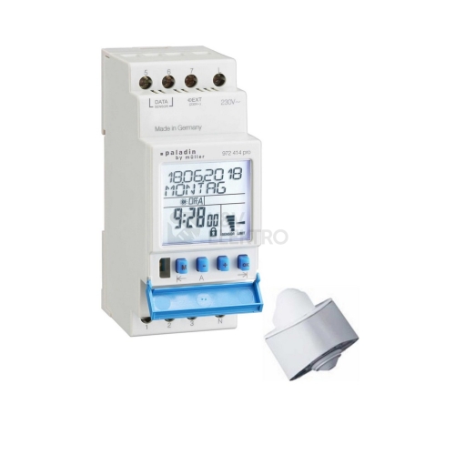 Spínač soumrakový PALADIN 972413pro - rozsah nastavení 1-50000lux, jmenovitý proud 16A, jmenovité napětí 230V, s externím čidlem, krytí IP54, montáž na DIN lištu
