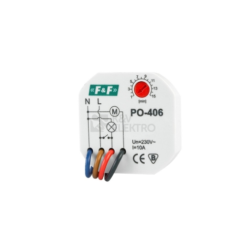 Časové relé s opožděným vypnutím PO-406 - montáž do krabice (pod vypínač), časovýrozsah 1-15min, napětí 230V, příkon 0,56W, proudové zatížení <(><<)>10A, proud ovládajícího impulzu <(><<)>300mA
