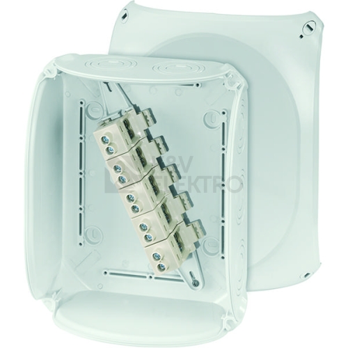 Kabelová krabicová rozvodka z vysoce kvalitního termoplastu pro nechráněnou instalaci ve venkovním prostředí nebo pro nástěnné aplikace v budovách. Odolné proti povětrnostním vlivům, jako například UV záření ze slunečního světla, chráněno proti dešťové vodě, teplotně stálé a nárazuvzdorné. Upevnění víka pomocí rychlouzávěrů. S vnějšími (stěnovými) úchyty. Odolné proti mořské vodě pro použití v přímořských oblastech. Se schválením pro instalaci na lodích. Svorkovnice se 2 svorkami na každý pól do 25 mm², 5pólová. Kabelový vstup přes metrické předlisy ve dně a stěnách skříně. Montážní kabelové vývodky součástí příslušenství.