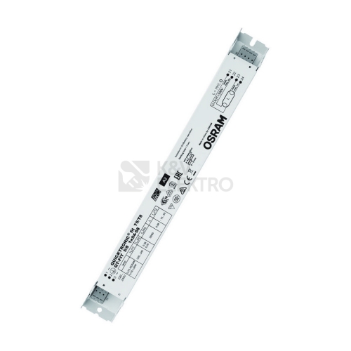 Výhody produktu: Dlouhá životnost světelného zdroje. Žádné nepříznivé dopady při častém zapínání a vypínání. Automatický restart po výměně světelného zdroje. Perfektní zapínání světelného zdroje pro instalace s pohybovými čidly. Systém certifikovaný podle VDE/VDE pro EMC. Velmi vysoká energetická účinnost díky odpojovací technologii. Vlastnosti produktu: Napájecí napětí: 220…240 V. Síťové napětí: 198 – 264 V. Kmitočet: 50 Hz | 60 Hz. Zapnutí světelného zdroje s optimálním předehříváním vlákna. Index energetické účinnosti EEI: A2. Automatické vypnutí vadných světelných zdrojů a zdrojů na konci života (EoL T.2). Provoz světelného zdroje: po EN 60929. Bezpečnost: podle EN 61347-2-3. Druh použití: Společné kanceláře, chodby a skladovací prostory. Veřejné budovy. Světelné pásy. Vhodné pro nouzové osvětlení (provoz na stejnosměrný proud). Vhodné pro svítidla třídy ochrany I. Modernizace stávajících systémů.