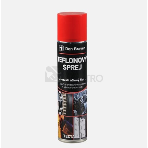 Teflonový sprej Den Braven má univerzální použití. Promazávání tepelně namáhaných dílů, kluzných i třecích ploch apod. Vhodný na kov, gumu, plasty v průmyslu, elektrotechnice, ale i v domácnosti. Mazání elektromagnetických ovladačů, teleskopických antén, pantů a zámků. Zabezpečí dlouhodobé a kvalitní promazání dílů. Odpuzuje nečistoty, prach, vlhkost, vodu, je antiadhezivní. Odolný solím, zásadám, kyselinám a teplotám od -50°C do +260°C.