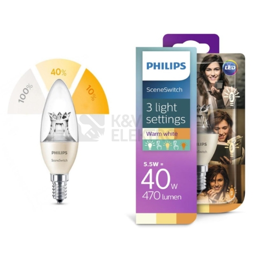Zvolte kvalitu zpracování a dlouhou životnost s miňonkami - LED žárovkami Philips které mění teplotu světla. Vytvořte jedinečnou atmosféru díky skvělým vlastnostem značkových LED žárovek s teplou bílou barvou světla. Oceníte dokonalé světlo i okamžité rozsvěcení bez nahřívání. Patice E14 má zpravidla nižší světelná výkon, hodí se tedy pro menší nástěnné osvětlení, složitější lustry, či třeba koupelnové a chodbové osvětlení. LED žárovka Philips SceneSwitch má výkon 5,5W a úzkou šroubovací patici E14. Je možné jí nahradit klasickou 40W žárovku. Má zajímavý vzhled a tvar svíčky, který se hodí do lustrů a úzkých lampiček, kde bude vidět. Ihned po zapojení je k dispozici široká škála skvělých světelných scén, které uspokojí vaše potřeby a nálady. Systém ovládání je v samotné žárovce, takže není třeba další stmívač či instalace. Stačí svoji žárovku nahradit žárovkou SceneSwitch a můžete pohodlně přepínat mezi různými scénami použitím stávajícího vypínače na zdi. Barva vyzařovaného světla je teplá bílá a hodí se do obývacích prostorů vašeho bydlení. ##VIDEO:https://www.youtube.com/embed/Fu5oDC3wTWE##