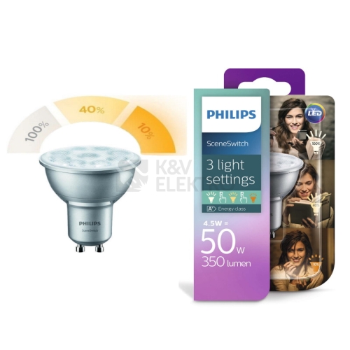 Oblíbená značková LED žárovka s paticí GU10 vás přesvědčí kvalitou svého teple bílého světla i vysokou životností. LED reflektor GU10 od firmy Philips nabízí to nejlepší. LED žárovka Philips SceneSwitch má výkon 4,5W a patici GU10, můžete jí použít jako náhradu za klasickou 50W žárovku. Můžete pohodlně přepínat mezi různými scénami použitím stávajícího vypínače na zdi a můžete snadno měnit atmosféru tak, aby odpovídala vaší náladě nebo tomu, co zrovna děláte. Barva vyzařovaného světla je teplá bílá, která se hodí všude tam, kde trávíte mnoho času, nebo kde odpočíváte. Nepřehlédněte další LED reflektory GU10 a k nim kompatibilní svítidla s paticí GU10. V nabídce máme také velký výběr kvalitních LED trubic a LED pásků a dalších světelných zdrojů. Podívejte se také na naši kategorii svítidel. ##VIDEO:https://www.youtube.com/embed/Fu5oDC3wTWE##