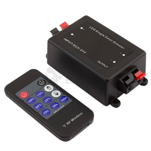 Stmívač pro jednobarevné LED pásky s možností stmívání pomocí dálkového ovladače.Technické parametry: Zatížitelnost (W): 96 Pro: jednobarevné LED pásky Počet barev: 1 Počet efektů: 3 zpoždění Stmívání: ano Max. proud: 8 A Krytí: IP20 Pracovní teplota: - 5 °C až + 50 °C Napájecí napětí: 12 - 24 V DC Dosah DO: RF 10 m Vlastnosti DO: Individuální kód Rozměry: 115 x 56 x 34 mm